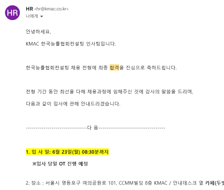 면접 분위기는 좋았고, 다음날 최종 합격이라는 통보를 받았다.