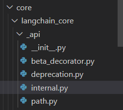 내부 폴더를 열어보니 역시나 이렇게 langchain_core 에 각 기능들의 구현체들이 있는데 가장 먼저 보이는 _api 폴더를 읽어봤다.