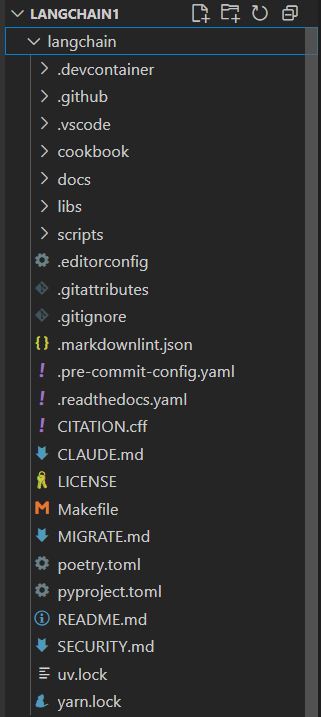 지난번엔 langchain의 공식 문서를 어느정도 훑어보았고, 이제는 본격적으로 코드에 대해서 뜯어보려한다. 우선 langchain의 폴더 구성은 이렇게 되어있다.
