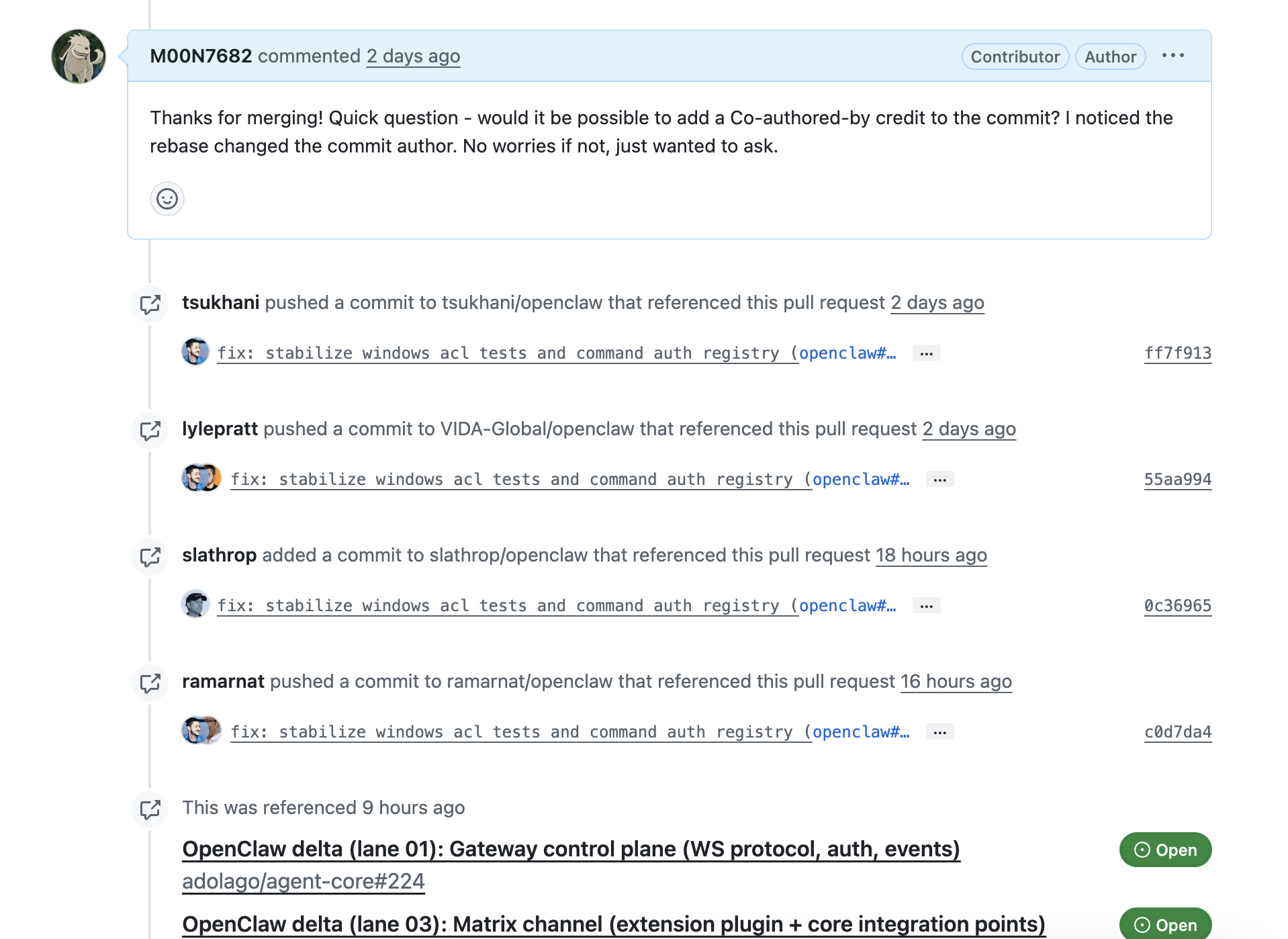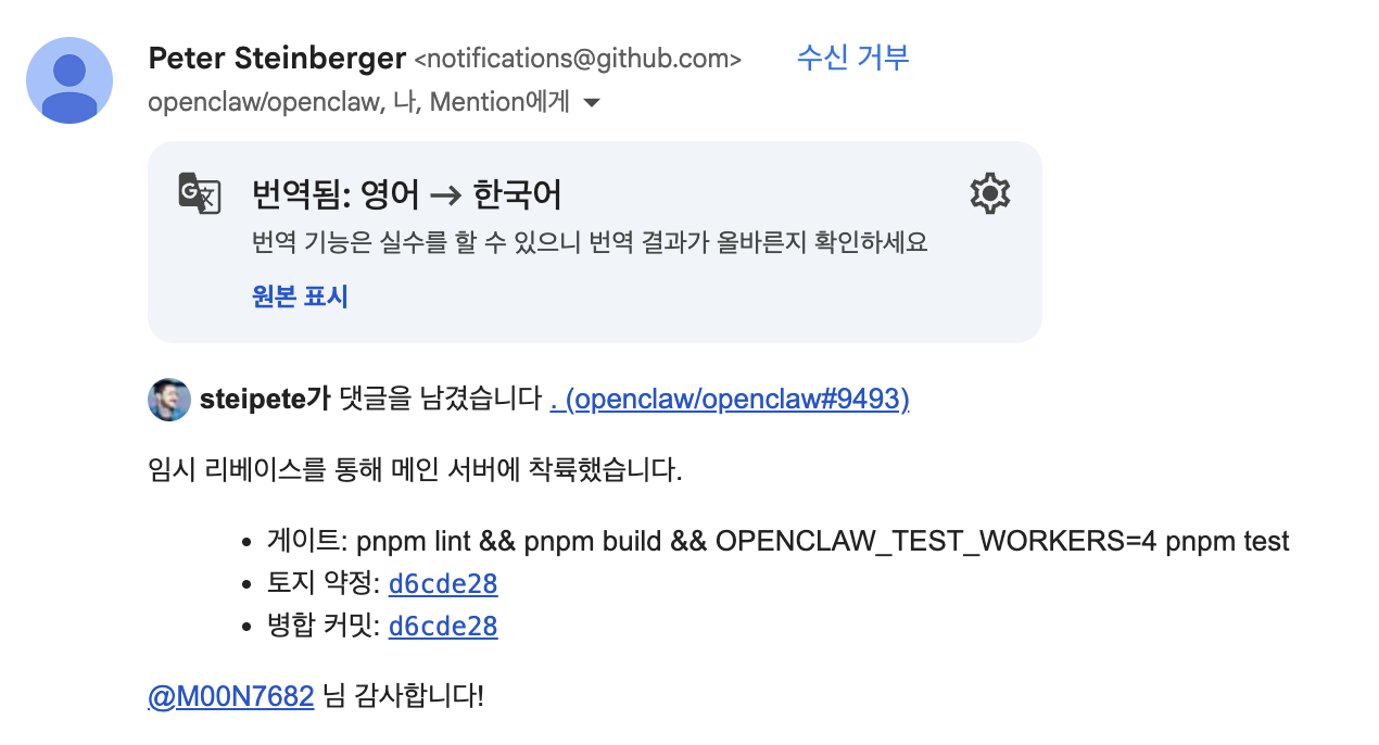 Openclaw의 메인테이너인 steipete가 main에 merge시켰다는 메일을 받았다 ! 아니근데.. 왜 rebase했지? 솔직히 큰 차이는 없지만 저렇게 rebase하면 PR의 author이 한 번 사라지기 때문에 내가 contributor로 안남는다는게 좀 마음에 안들었다. 물론 쟤나 나나 여러개 터미널 띄워놓고 열심히 토큰을 태워가며 Openclaw의 main branch에 코드를 반영하는 사람이지만 그래도 내가 시간 쓴 만큼 contributor로서 흔적을 남기고 싶었다.
