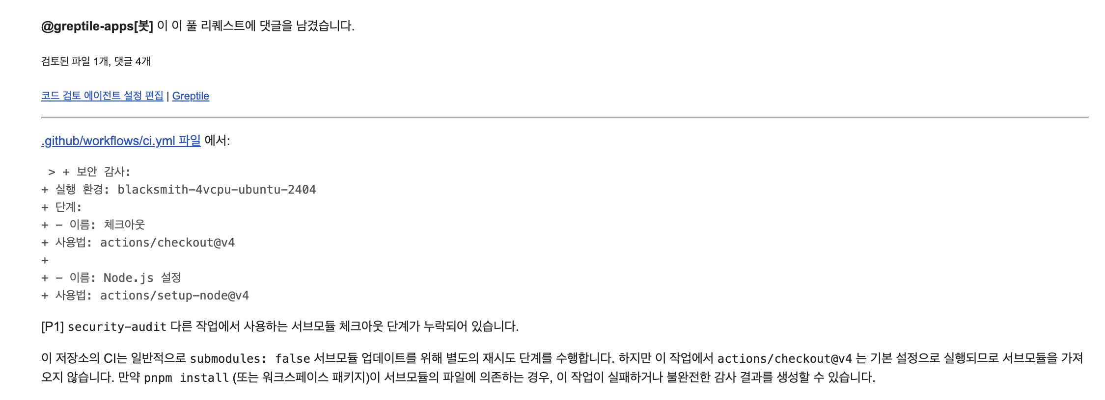 CI 하는 과정에서 뭔가 이슈가 있었는지 PR을 올린지 하루정도 뒤에 저렇게 comment가 달렸고, 확인한 내용을 즉각 수정해서 이것저것 다시 PR을 올렸다.